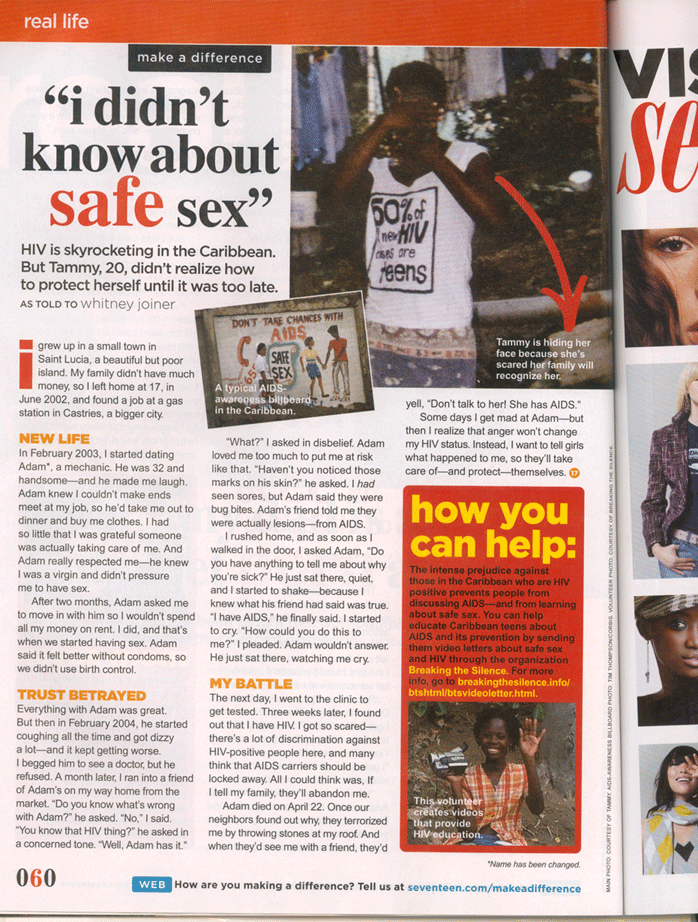 With support from Breaking the Silence, Seventeen Magazine will publish the story of a young woman in St. Lucia who is living with HIV. In a country where nobody is talking publicly about being HIV positive, this is an incredible stride forward in the fight against AIDS! This young woman is very courageous and you should definitely check out her story. Look for the "Make A Difference" page in the January issue, which starts hitting newsstands everywhere in early December. Or click here to view the article.